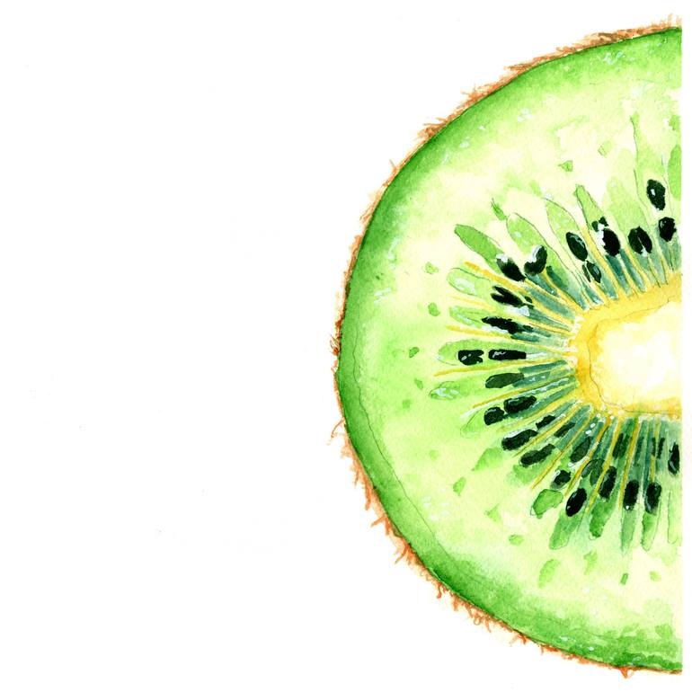 Watercolor painting of a cross section of a kiwi. Done with Windsor and Newton and Holbein watercolor paints of Arches 140lbs cold press paper. The size of the paper is 9" x 9".