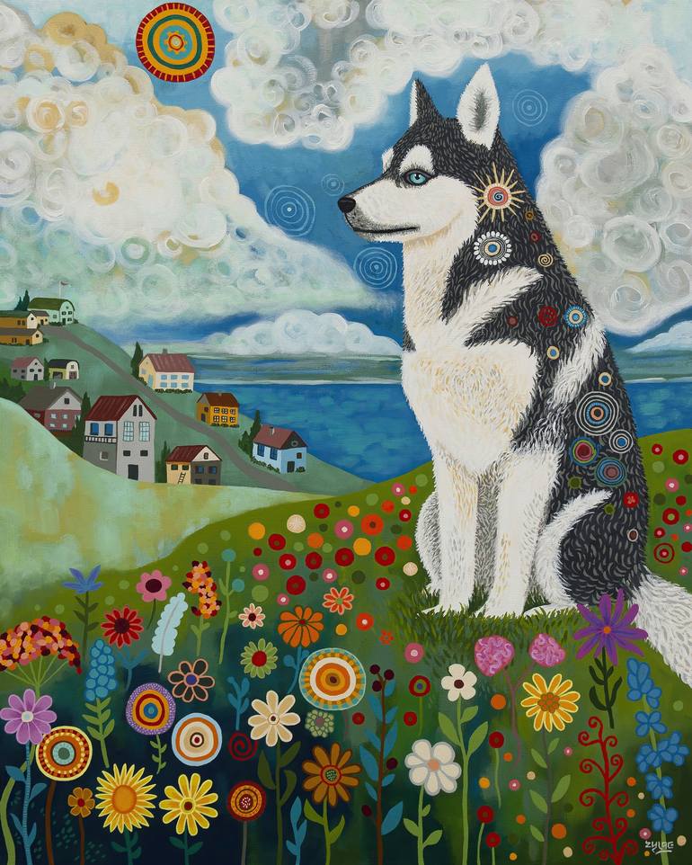 A Siberian Husky dog sits on a hillside covered with flowers. Houses adorn another hillside in the distance. The sky is filled with dramatic swirling clouds. This work comes ready to hang. The painting extends around the sides of the canvas. So, you only need to frame it if you want to.
