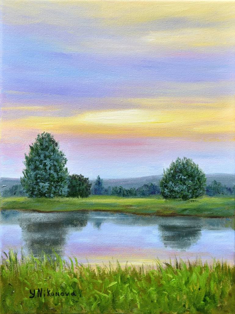Twilight Hues - a small original oil painting on canvas by Yulia Nikonova. Landscape painting with colorful skies over a meadow and a lake. A beautiful colorful accent for your home, bedroom, living room, dining room, entryway, or office. It’s a perfect gift for your family, friends, colleagues, an...