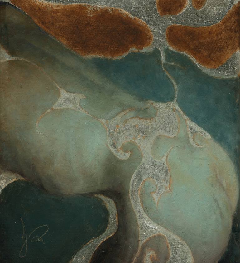 Gilded with silver metal leaf which reflects light beautifully when viewed from differing angles... Inspired by fractals designs and the symbiotic relationship we have with nature. This piece was also a part of my exploration of different colour palettes and silverleaf gilding effects and materials...