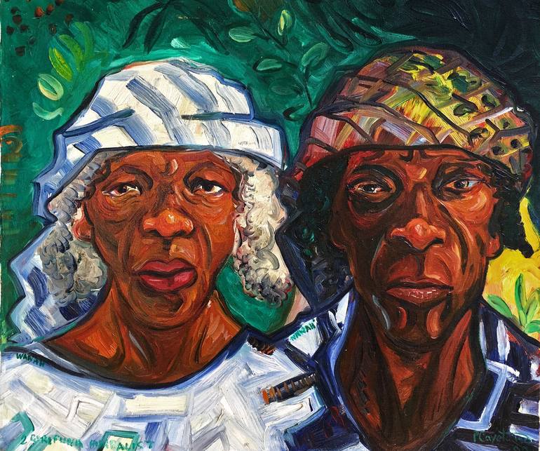 “Two Garifuna Herbalists (Wana and Nana)” Pen Cayetano Exhibited at the Casita Maria Gallery, Bronx, NY. 50 x 60 cm(19.7 x 23.6 in). Oil on Canvas. 2009. Inscription on back Left side character: "I cure meself and a could cure you too" Words of Wana Right side character: "Him Born with two foot...