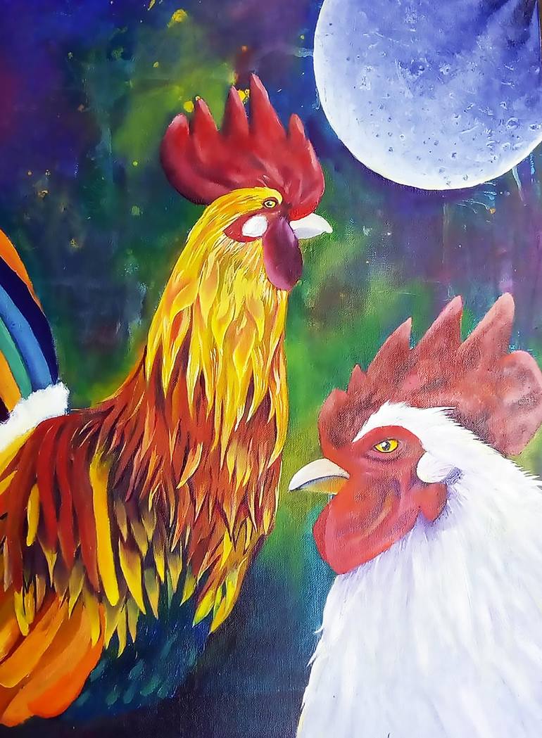 A blast of color and bright white lightens the late night as these two fowls steal the show over a full moon. The artist has brilliantly brought together these two nonidentical twins contrasting in color and poise on a single canvas. The portrait is beautified with detail and stunning hues. 10235-A...