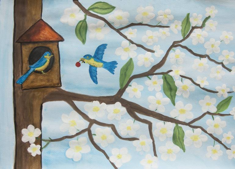 Two birds with birdhouse on tree with white flowers, gouache on paper. I live on wonderful resort St. Constantine and Helena in Bulgaria, where in spring birds are singing so lovely. Picture in seria paintings with two birds from collection "Birds". Picture with spring flowers and birds, which come ...