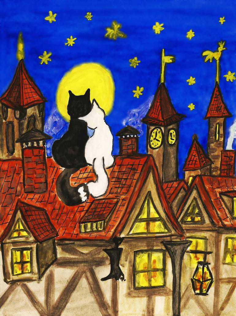 This picture participated in online exhibition "Domestic pets"from site "theanimalsartspace" England. Two cats black and white on roof of old European town with tiled roofs with moon and stars. Picture for child's room. All my pictures are unique and exist only in one example, I never do exact copi...