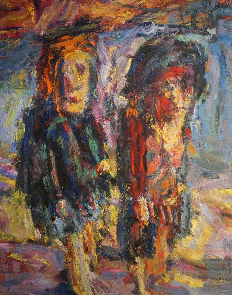 This painting depicts two persons that communicate each other having common considerations are walking the road.