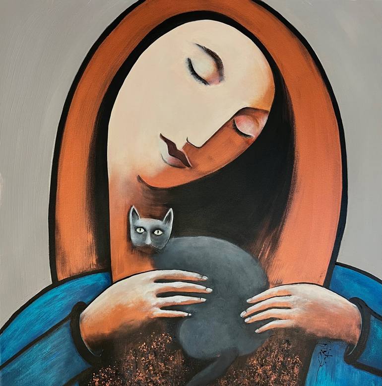 The simple act of caressing a cat in an almost abstract manner. I did not want proporations to imply realism ..... except for the cat. The female is a bit oversized as an exaggeration....... the cat is not. This painting is finished with a very high gloss finish and unfortunately most of the photo...