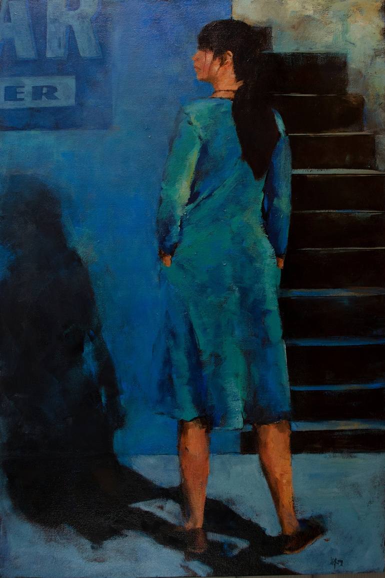 "Uncertain" is an acrylic painting on canvas which has been applied to a birch wood panel 24" x 36" x 7/8" . The paint application is very loose and impressionistic, yet the overall feeling of the work has a somewhat surreal feeling. The subject was a girl standing in a subway in Hannover, German...