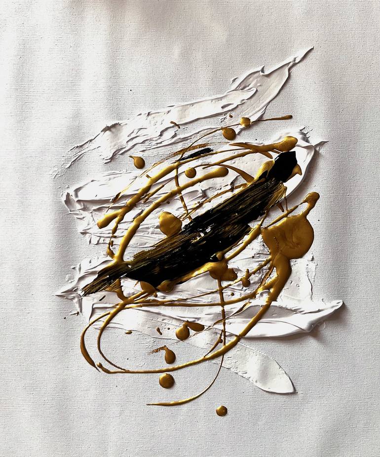 Original 1/1 from the “Unconscious” series by internationally awarded Brazilian artist Juca Maximo. In Unconscious IV, a bold black slash cuts across the canvas, surrounded by golden drips and sweeping arcs on a textured white ground. Minimalist yet powerful, the composition becomes a metaphor for ...