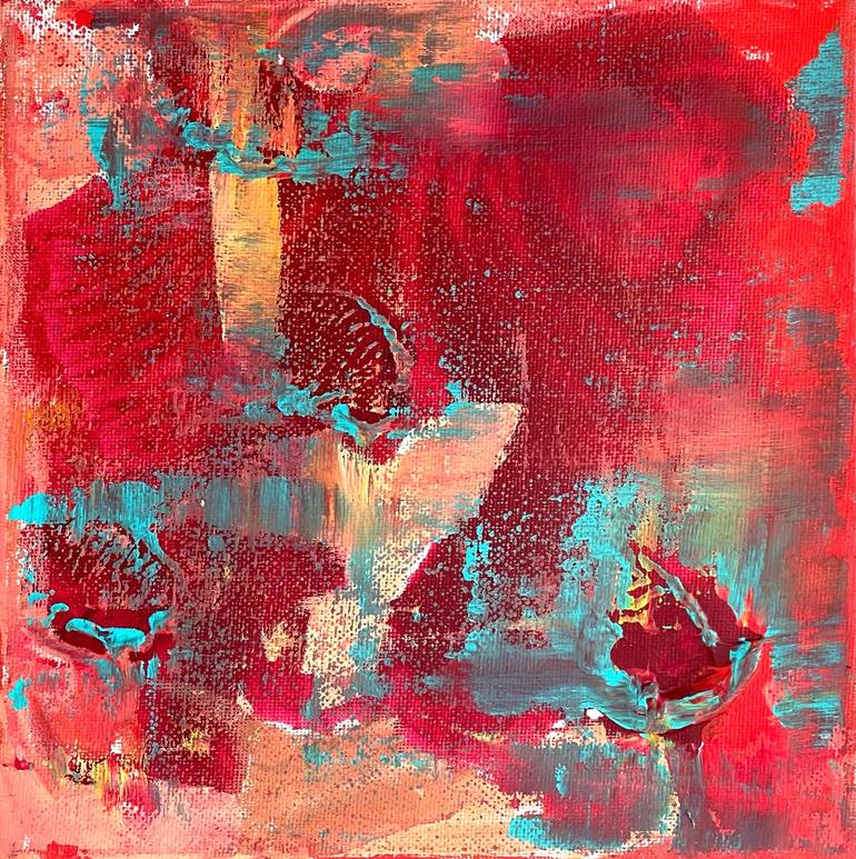"Under Cover" is a small, lively, painting on canvas. The main colors are red and turquoise. The painting is signed on the back so it can be hung as the owner wishes. The title and date of origin are also noted on the back. The sides are also painted in red. The artwork is ready to hang. The size...