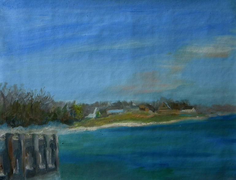 This was painted 'en plein air' in oil on canvas and then mounted on board. The view is from under the Atlantic Beach Bridge over Jamaica Bay in Nassau County, New York.