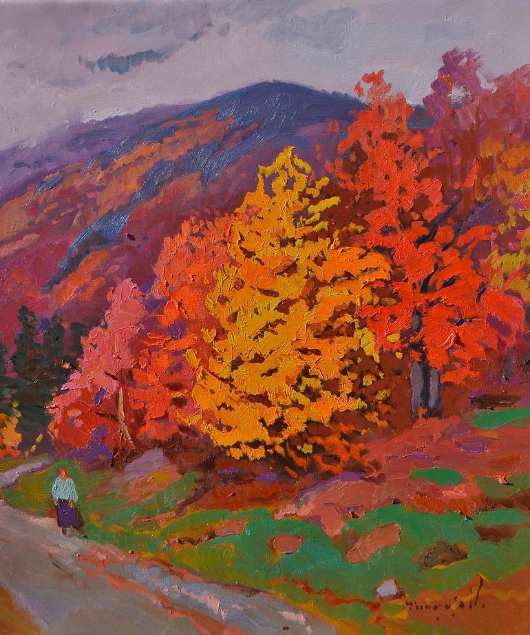 A vibrant landscape features autumn trees in shades of red, orange, and yellow, with mountains in the background. A solitary figure walks along a path, adding a sense of scale and tranquility.