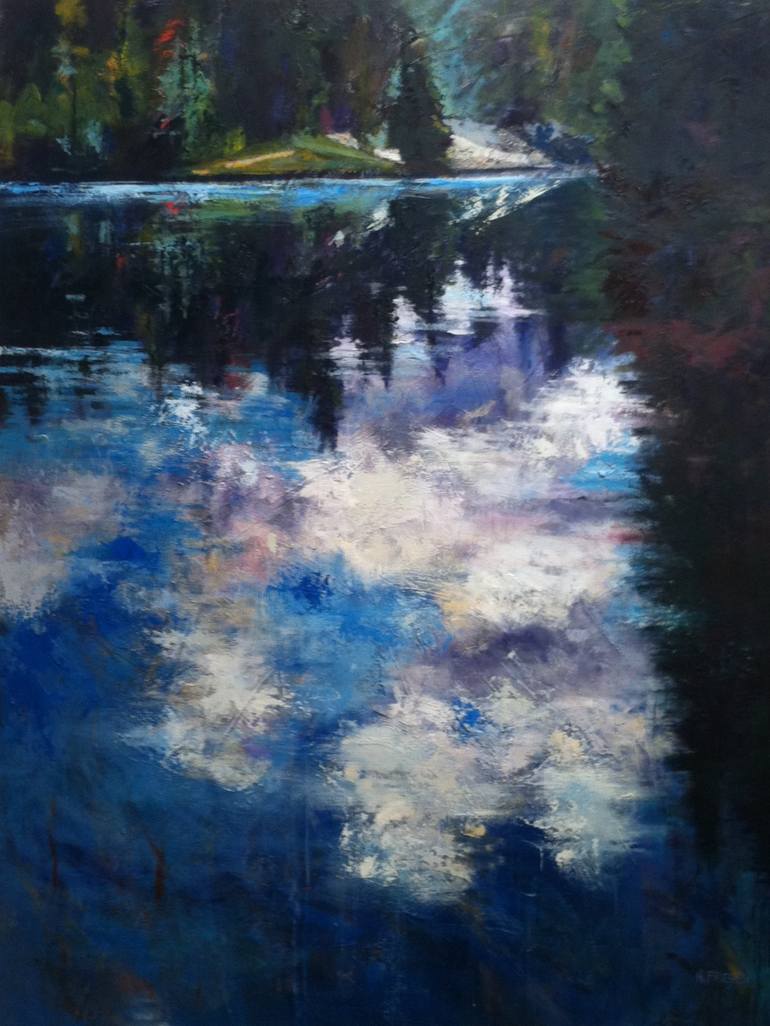 The inverted perspective of viewing the sky reflected within the river leads to a brief jolt of altered reality. Where are we? What is our perspective when things are altered? Live the questions. A deep blue moment of awareness. This Contemporary Canadian executed with artist quality materials to e...