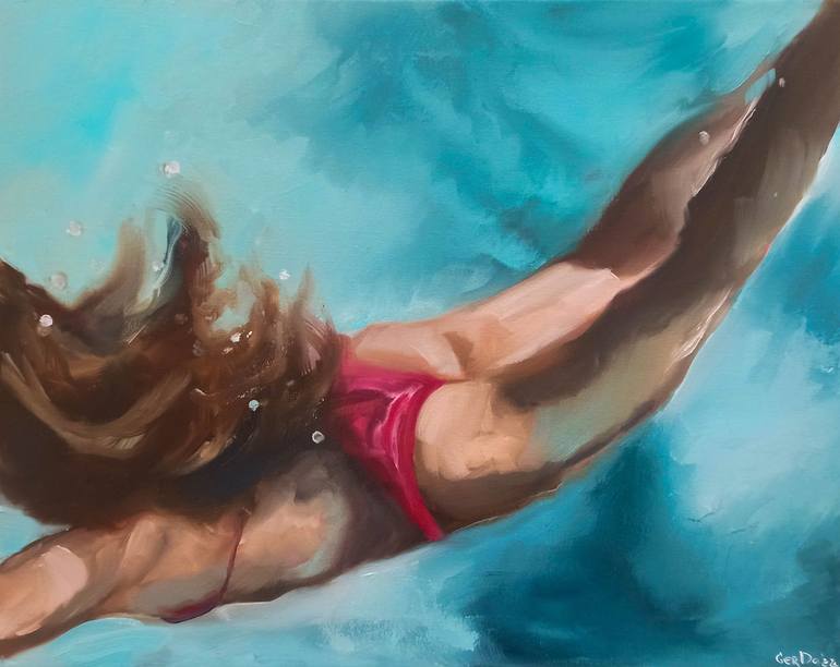 Having seen the beauty of the underwater world, the beauty of the refraction of light under water, I can't forget it. Now the essence of my creative research is water and its effect on the body. The work is painted with oil paints on a stretched canvas. The borders are painted in the color of the p...