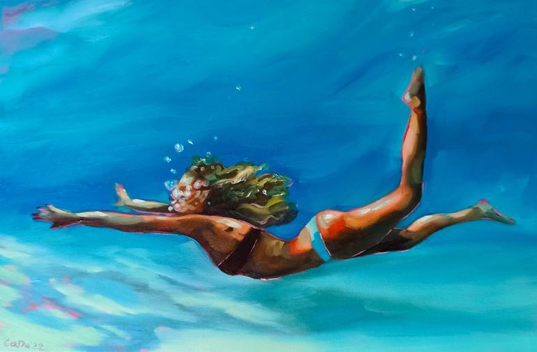 Underwater 4 - Female Figure Swimming Woman in Ocean Painting The work is painted with oil paints on a stretched canvas. The borders are painted in the color of the picture. Size: 19.7 x 23.6 Inch. Materials: stretched canvas, oil paints, brush. Unframed.