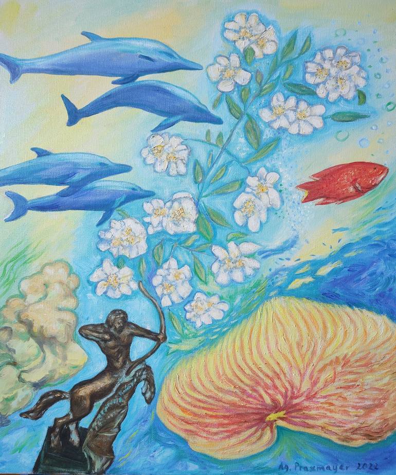 This painting was inspired by fantasy and underwater kingdom of coral reef and dolphins, happy and free ..This vision is a little bit surreal with flowers of jasmine in the middle and small diver... Realized in oil painting on canvas, gallery wrapped, arrives ready to hang.