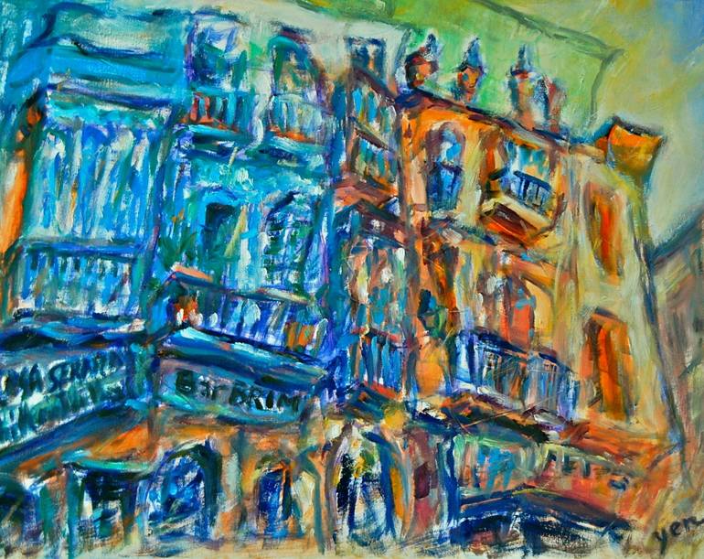 Abstract impressionist painting of surreal undulating buildings in Cadiz's spanish old town street, with contrasting orange blue shades. Spain Vignettes Series.