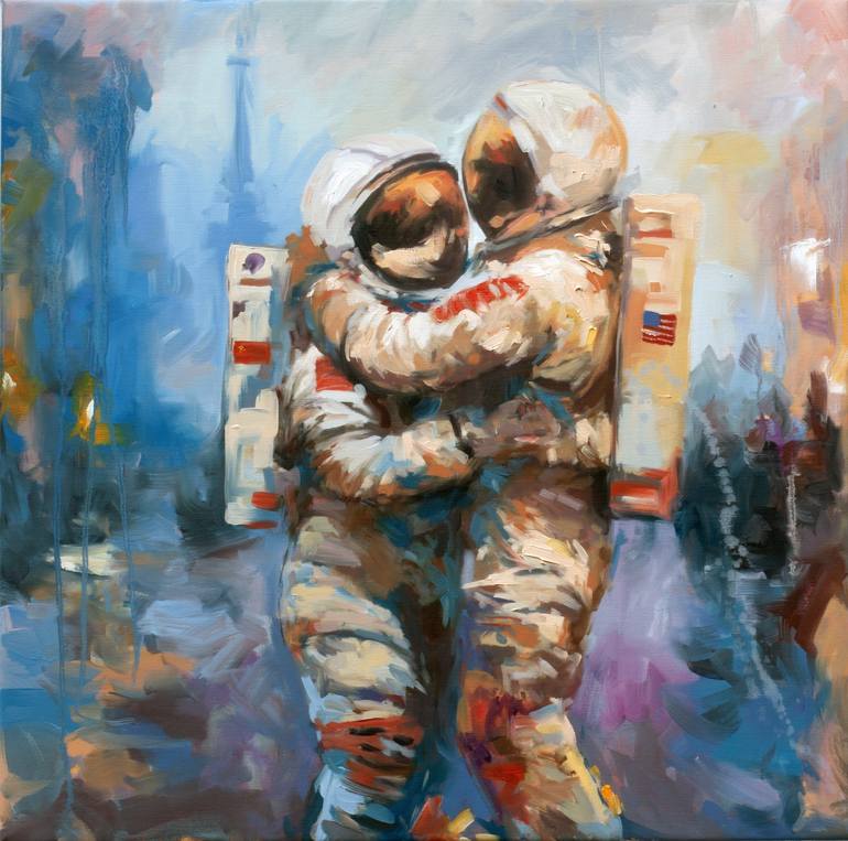 "Universal Love" is a poignant 70x70 cm oil painting by Alexandr Klemens, portraying the secret romance of two introverted astronauts journeying through the cosmos. Hailing from different cultures, their love defies societal norms, capturing the essence of forbidden affection in a universe vast and ...