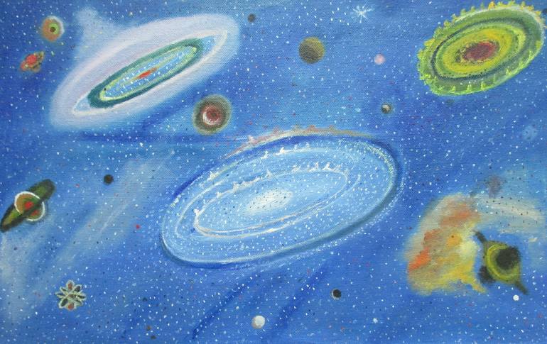 I am trying to paint the outer space. Some of it we can see through naked eyes. Other things as we have seen through telescope and satellite. The whole painting depicting the cosmos. Hope it gives that feeling.