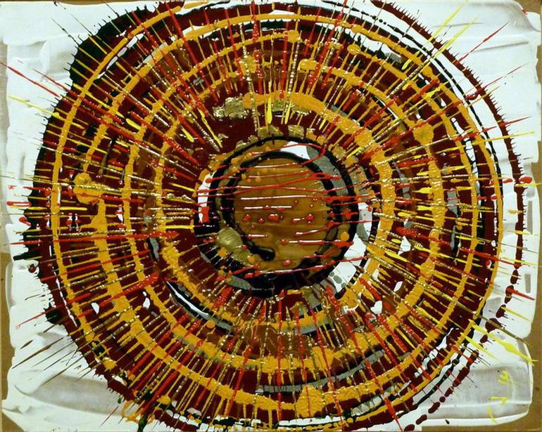 This work, created with synthetic enamels on a sturdy masonite base, appears as a mandala with a striking visual impact: concentric circles and radial lines expand outwards from the centre in bursts of reds, yellows, and golden browns. The composition suggests an energetic core radiating vitality an...