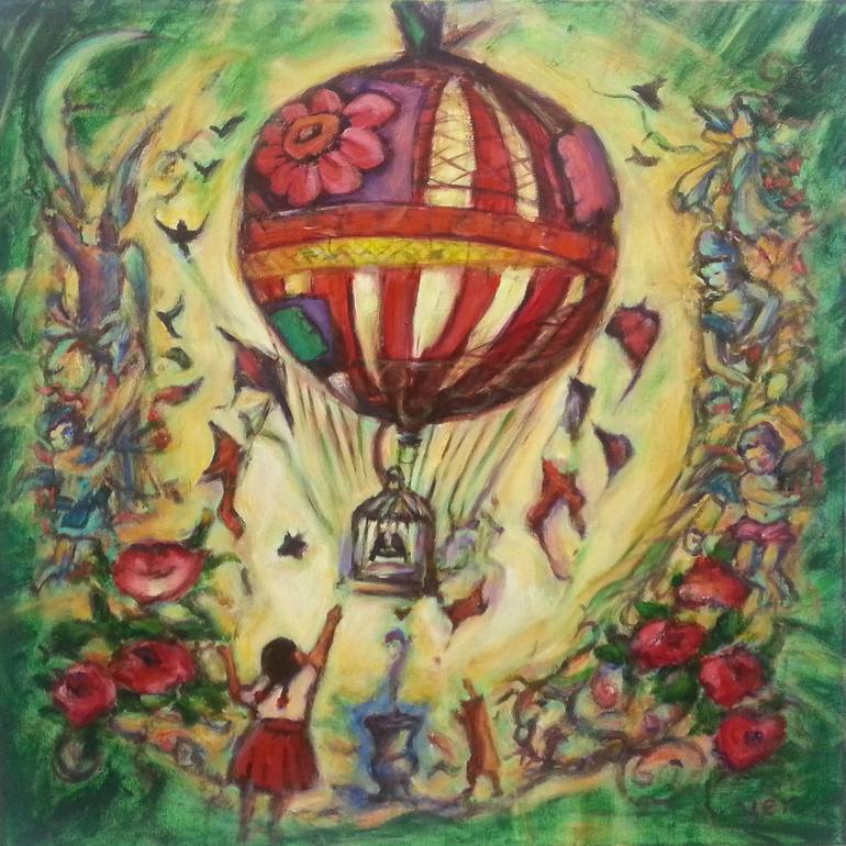 Whimsical painting of a little girl and a cat reaching out for a fly away hot air balloon with a birdcage in tow, trailed by roses, angels and vintage symbols. From artist Yen's Untitled series, based on the central theme of being a child again, with a little girl surrounded by whimsical things, be...