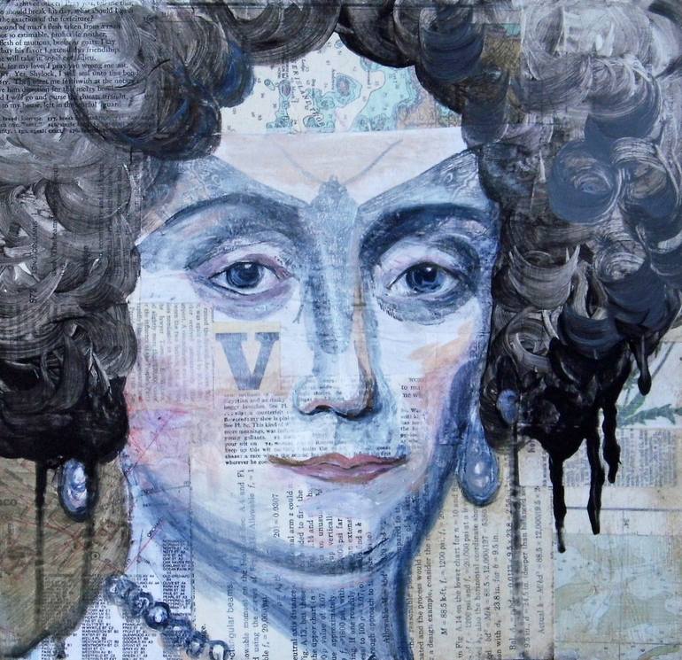 A baroque portrait of a lady, from my Deconstructing Venus series. Acrylic and collage with vintage maps, newspapers and paper ephemera on birch plywood. Edges painted white, wired and ready to hang.