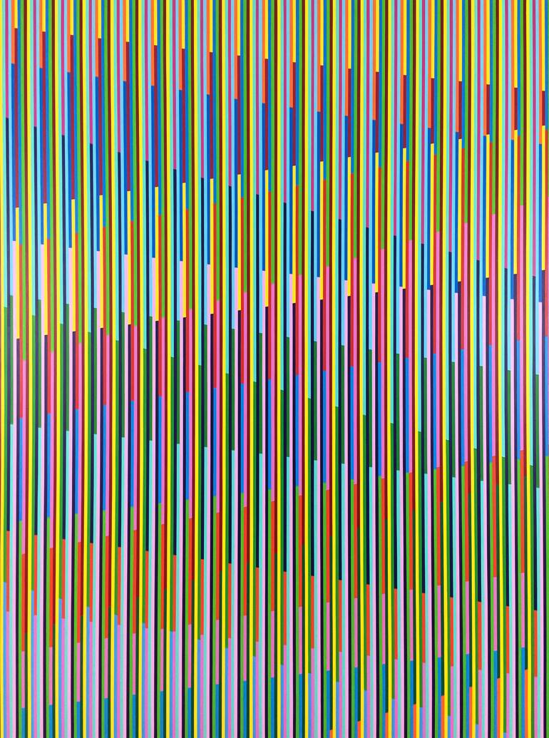 Layered and alternating stripes of color are constructed to create a spatial effect of overlapping planes. Part of the Interlace series, exploring the interaction of colors and the sensations of depth and movement. In each work, several groups of rhythmic stripes of color move above, below, and acro...