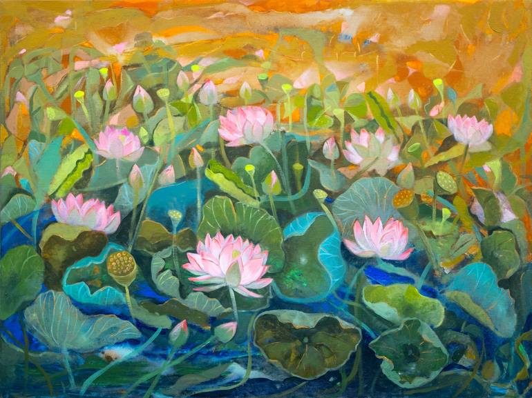 I believe that a better world is possible if only we return to nature and let it heal us. I consciously use this belief to create large, colourful paintings of lotus ponds that I hope will help others feel the same peacefulness and connect with their own inner feelings of joy, stillness, and content...