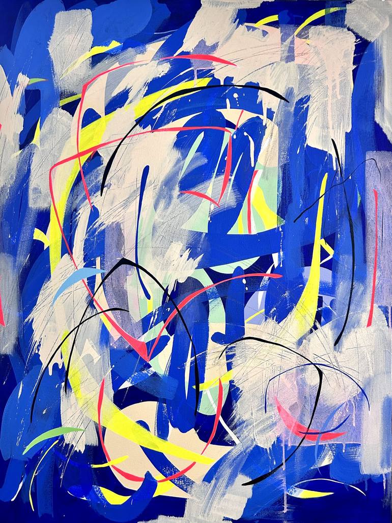 The vibrant interplay of strong blue and neon yellow captures a sense of emotion erupting from within, reminiscent of fireworks igniting against the blue skies of my childhood. This dynamic contrast serves as a visual metaphor for the intensity and spontaneity of formative experiences, translating f...