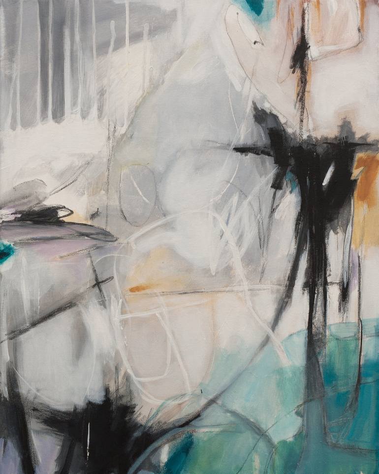 Abstract painting created with the highest quality paint on stretched canvas. Turquoise, white and black are prominent colors. Hints of gold compliment the color scheme subtly.
