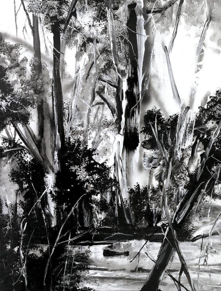 Born in 1977 The term Locus Neminis was used in ancient Rome to refer to the silva, the wild forest areas, considered places belonging to no one. In a sense, that is how I think of the places suggested by my paintings. Each one is an interstitial zone that bears the traces of my passage and constitutes a place of transition where the viewers and I exchange looks. We stand outside the work together, looking in. I use black and white to create a balance, assert an abstraction. By putting reality at a distance, haunted or dreamlike echoes can be heard.