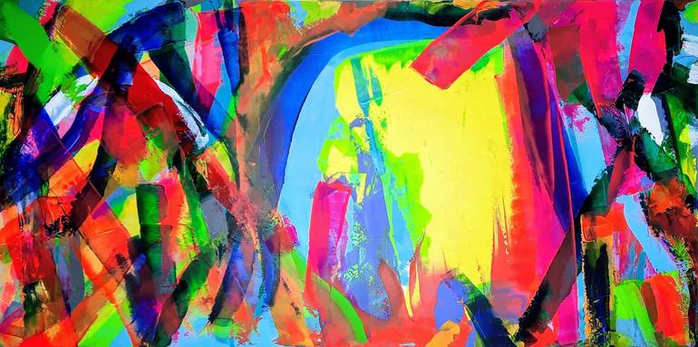 Painting consists of broad sweeping strokes that convey a sense of movement. The colours overlap like a tapestry of pigment.