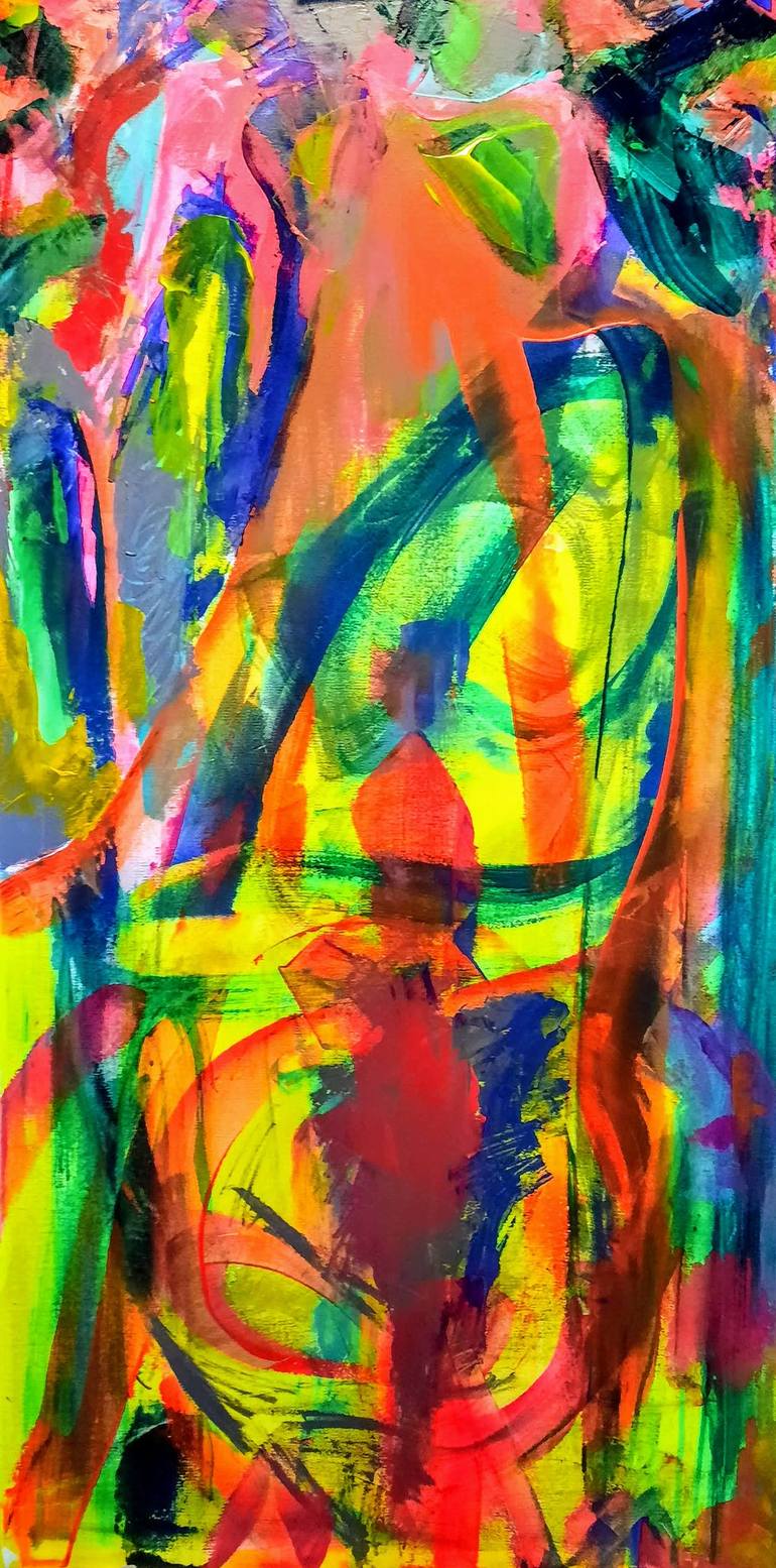 This abstract painting is inspired by the fluorescent colours and free flowing gestures. The artist technique is showcased by the unique forms and swooping gestures.