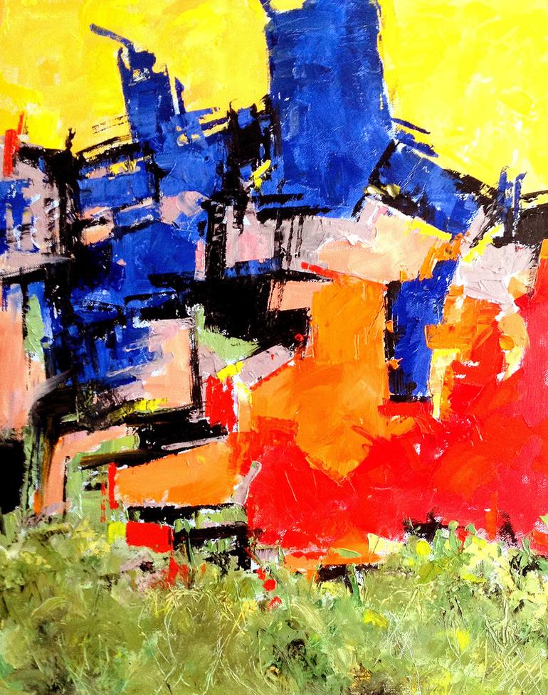 This modern abstract is mostly painted with a knife to create texture within the surface. Using strong colour to heighten the dynamics of the subject matter. The foreground grassed area shows a lot of varying textures to enhance the piece. My inspiration for this work comes from photographs of the 2...