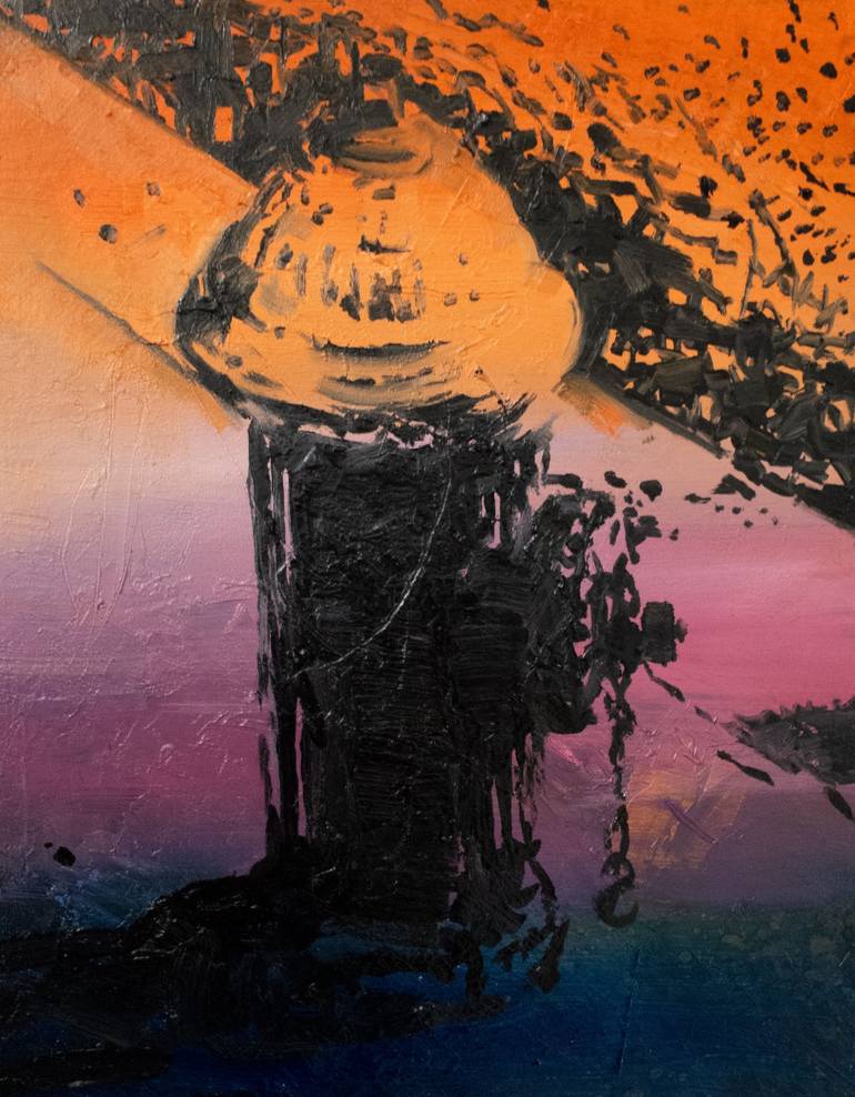 In Urban Sentinel, Benites transforms a humble fire hydrant into a striking symbol of resilience against a backdrop of shifting color and light. The bold, impasto strokes of black create a commanding silhouette, while the gradient wash of orange, violet, and deep blue evokes the changing moods of th...