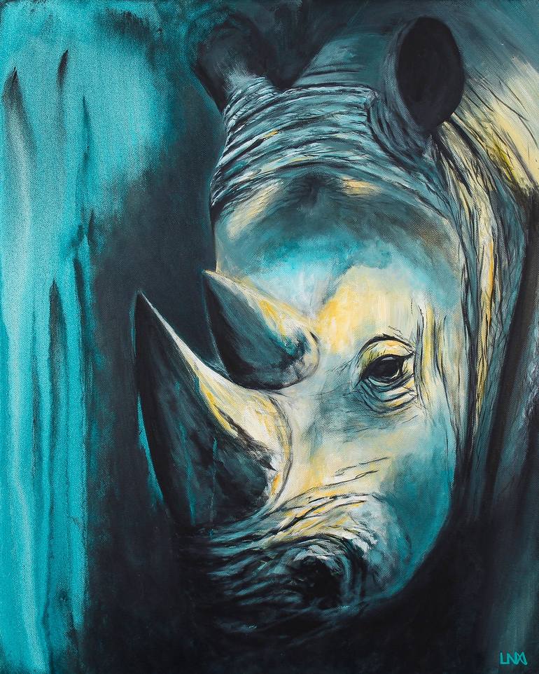 Cette nouvelle œuvre animalière "Us" de l'artiste Helena Monniello représente un rhinocéros. Elle est réalisée avec des couleurs bleus et jaunes. Cette peinture nous représente, c'est pour cette raison qu'elle l'a nommé "Us". Nous c'est à dire tous les êtres vivants dans le monde. Nous sommes à la f...