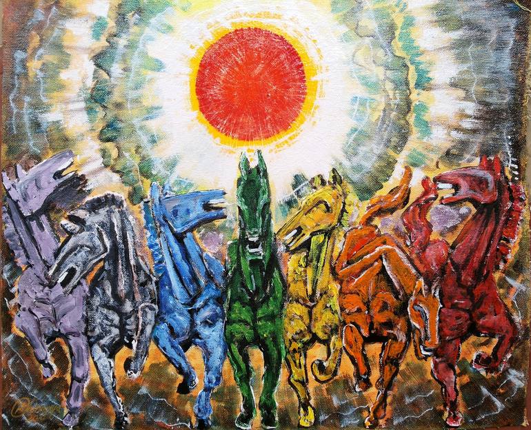 In Hindu Mythology God Sun travels the cosmos in his chariot driven by seven horses and the able charioteer God Aruna. I have represented these seven horses as the VIBGYOR of the Sun's Light.