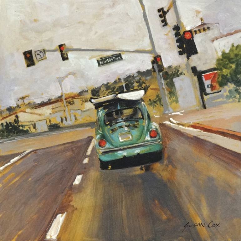 I’ve always loved cars and have used them in many paintings. I live in a surfing town so it’s not unusual to see surfboards on cars but they look especially cute atop a VW.