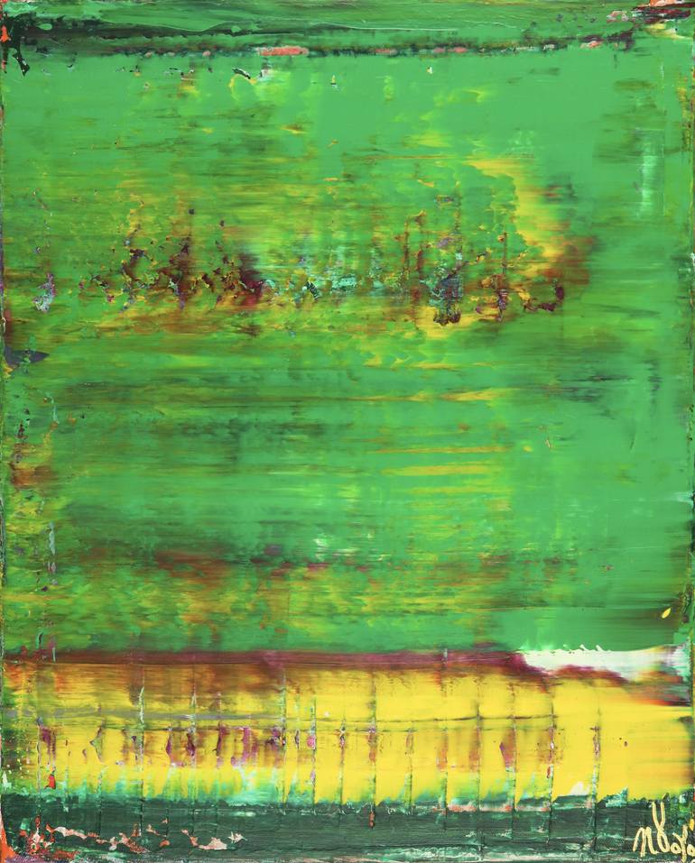 Bright abstract with vivid and earthy colors. Green, yellow, terra. Signed in front and ready to hang. For this work I used a large palette knife and hand mixed acrylic paint and mediums. The work is completely created spontaneously and is allowed to develop organically with no preconceived directi...