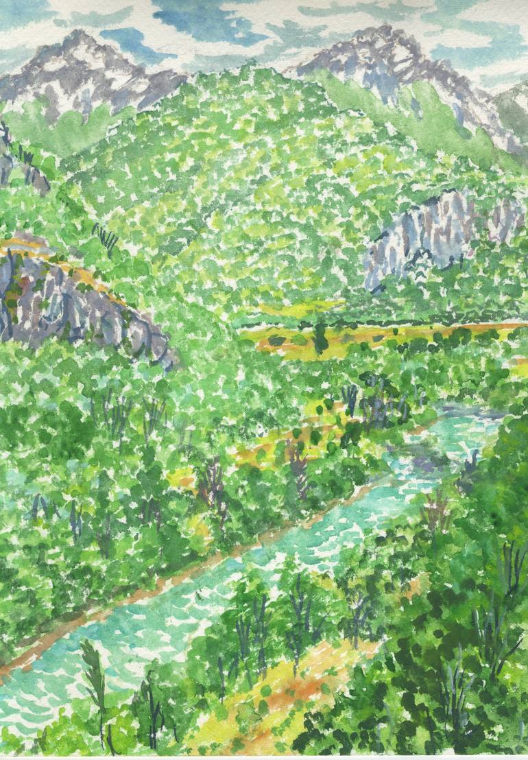 Along the road in intermittent drizzle, up in the Chilean Andes, pastures and spectacular views abounded where I fond this spot to relax and paint. A gusty wind would blow about but the rustic shelter nearby helped to dry off. The turquoise river below wound its way through this alpine landscape.