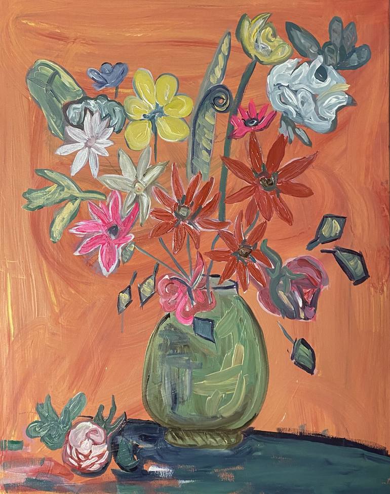 Born into a princely family, that fled from revoltion, Agustus was separated at infancy from them, and found himself growing up in an orphanage outside of Baton Rouge, Louisana. As a small child, inspired by a Cuban legend about a small man who lived in the dark waters of the village of Batey on the rivers, in reality what could bring that story to the popular imagination is that the marginalized people were not extinct in its entirety the knowledge they had of how to fish and marry. Years later, skeletons of very short people were found. They were not registered as normal inhabitants, but as an indigenous settlement in the Batey area. I remember that as a child, playing in the streams near the orphanage, when the rising of the estuary that fed, what we called, the hope river in touched the highest parts of the banks, we discovered a clay pot that we played with until they broke, they also told us about the owner of the water who lived in a deep and dark pool as soon as the sun shone the jucaro trees’ leaves did not let the light penetrate through to the waters. Our elders told us when we were back at the orphanage not to go fishing or hunting near the streams. They said they shouldn't let us fish there or the pool owner of the water will come out and catch them, one day we forgot what they always repeated to us. Imagine what we were given was such a scare that we lost everything we had in our hands. As time passed we were given a house in the countryside. My cousins told me that the owner of the water was two Amazon pink dolphins, and we later see how it changes all the perspectives of something that does not clearly bring fear into your life. “When we look at the work of an artist, we often wonder about the inspirations that cause the creation of a piece of museum quality art work. As a child, Agustus was drugged and sex trafficked for several years, to Thailand by the elders at the orphanage, along with others. Later, as an adult, he struggled with disassociative disorder. In the fall of 2021, he was arrested for lighting a cigarette in the flight terminal at JFK airport and instutionalized for several weeks. Vase of Plastic Flowers, 2022, for example, was painted recalling colors of the hospital walls and rooms in the institution, and memorializes the artists perspective on mental health treatment and social platitudes and constructs of artifice in the social order.” Mesh Kaneebab, Phd student, Fordham U.
