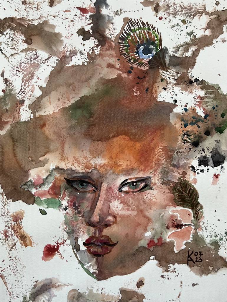 Vasilisa the beautiful 2023, 9*12 in, watercolor on paper, surrealism This watercolor portrait reimagines Vasilisa, the legendary Russian fairy tale heroine, in a contemporary artistic style. The painting captures her mythical beauty through ethereal watercolor techniques, with peacock feather deta...
