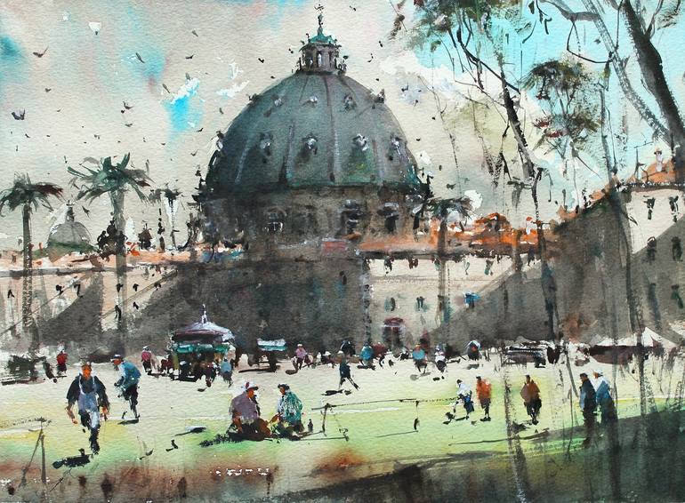 STATEMENT: Italian watercolorist Maximilian Damico paints primarily on location. He observes city sidewalks and intersections, looking for not the most famous scenes but the most interesting. With quick, lively brushstrokes, Maximilian captures the energy and mood of cities whether in the rain, gloom, or rush hour. The frenetic quality of city life doesn’t detract from the beauty of each scene. Maximilian’s gestural technique instead infuses liveliness in each artwork, a liveliness that makes being in a big city a never-ending thrill. PROCESS: I usually work on location, just sometimes I do several sketches of the same theme and then I go to complete it in the studio...usually I do finish a painting one going on (this is essential in my technique). I do not mind about famous sight seen, but I like walk in some place to find an aesthetic details or an interesting game shadow/light. Basically I approach the painting with a separate palette warm and cold colour, the contrast lets have an interesting three-dimensional and plastic effect; I try every time to move the brush as fast as I can, to catch the movement, that I am seeing in reality, on the paper...that lets the painting get the energy and the vibrations that I am constantly looking for in my style; I can use a very wet paper and brush full of water sometimes I use very dry colour......I never use very tiny size brushes for small details...but I am interested in the big block of masses, their contrast make the beauty in a painting. BIO: I was born in south Italy, and took courses of painting in Academy of Fine Arts in Naples; after the Fine Art 'Diploma', I left south Italy to have broader contact with the international Art scene, following different routes: as Barcelona, London, Paris, New York and Prague: where I maturated my own style made by semi abstract elements and expressionist executions and techniques. I spent 5 years in this kind of wandering life, always looking for areas of visibility, collaboration and contracts with Art Galleries. Meanwhile I was achieving and accomplishing a good number of success and desires, has grown in me the germ of dissatisfaction: an awful virus in a mind of an Artist. For this reason I went back to my own village in Italy on Amalfi Coast, to dig in myself: where after a while , for joke, I applied for a watercolour art contest .
