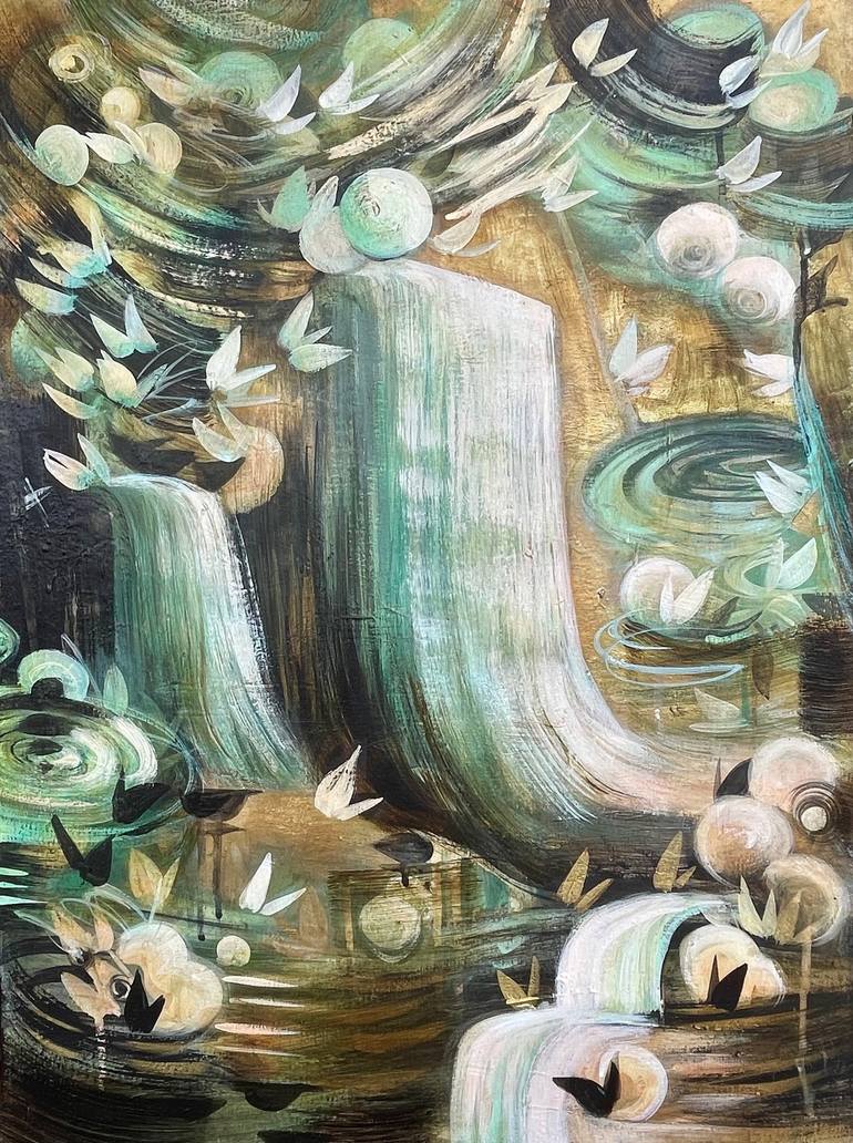 My paintings are abstract landscapes depicting atmospheric spaces inhabited by natural forms and archetypal elements, using colors that hold emotional resonance for me. The palette incorporates colors from nature such as turquoise, aqua, and earthy tones combined with metallic gold, black and white....