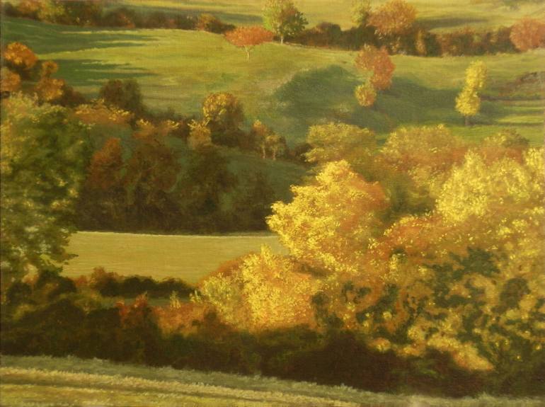 Educated in England, I trained as an art restorer in Italy, first in Venice and then in Rome subsequently working on a variety of different artifacts. After many years in Tuscany I am now based in Campania. Though I drew from an early age, I approached painting only in the recent years calling upon the knowledge of the use of colour, the techniques of the old masters and the behavior of different materials. As a nature lover, landscapes are my preferred subject, rarely “contaminated” by the presence of mankind. In easel paintings I work from a neutral ground (which often acts as a medium tone ) juxtapositioning thin oil colour without any glazing, usually using a single dagger brush. In murals I work with fluid acrylic colour on a white luminous ground producing a mat gauche o tempera effect. Recently I discovered the pleasure of painting on wood using reclaimed door panels, gratifying also for my belief in the coalition economy-ecology. This however limits me to small formats where, not wanting to lose any feature, I inevitably use much detail. Contradictorily, having a keen interest in architecture and interiors, I particularly enjoy the larger scale of murals and trompe l’oeils which have a greater visual impact, enhancing and integrated in their environment. Occasionally I also do sculptural work where the theme is invariably inspired by nature. I prefer working with commissions, necessary of course for murals or trompe l’oeils.