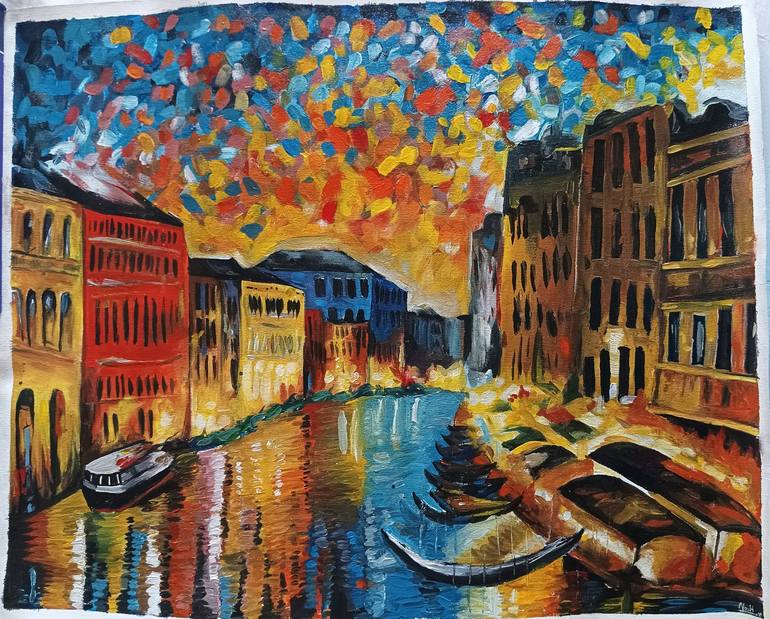This acrylic painting is a vibrant recreation of Alfred Afremov's *Venice Grand Canal*, featuring bold, expressive colors that capture the city's enchanting beauty. The Grand Canal and surrounding architecture are depicted with dynamic brushstrokes, creating a lively, reflective scene bathed in the ...