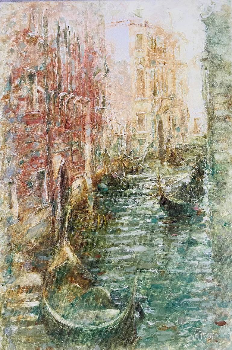 Italy Venice Gondola Art – Nostalgic Coastal Landscape, Grand Canal Boats, Terracotta & Ochre Romantic Cityscape Sun rays slip between old Venetian buildings, awakening quiet, thoughtful streets. Gondolas glide gently along the Grand Canal, catching warmth and light. This romantic impressionis...
