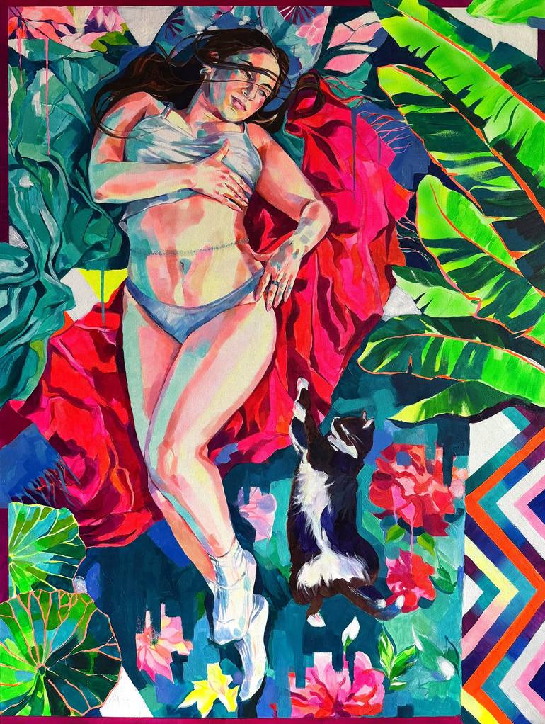 In this richly detailed and emotionally resonant painting, a young woman reclines in a moment of tranquil introspection, accompanied by a black cat. Inspired by the classical pose of Botticelli’s The Birth of Venus, this contemporary reinterpretation reclaims sensuality and softness through a modern...
