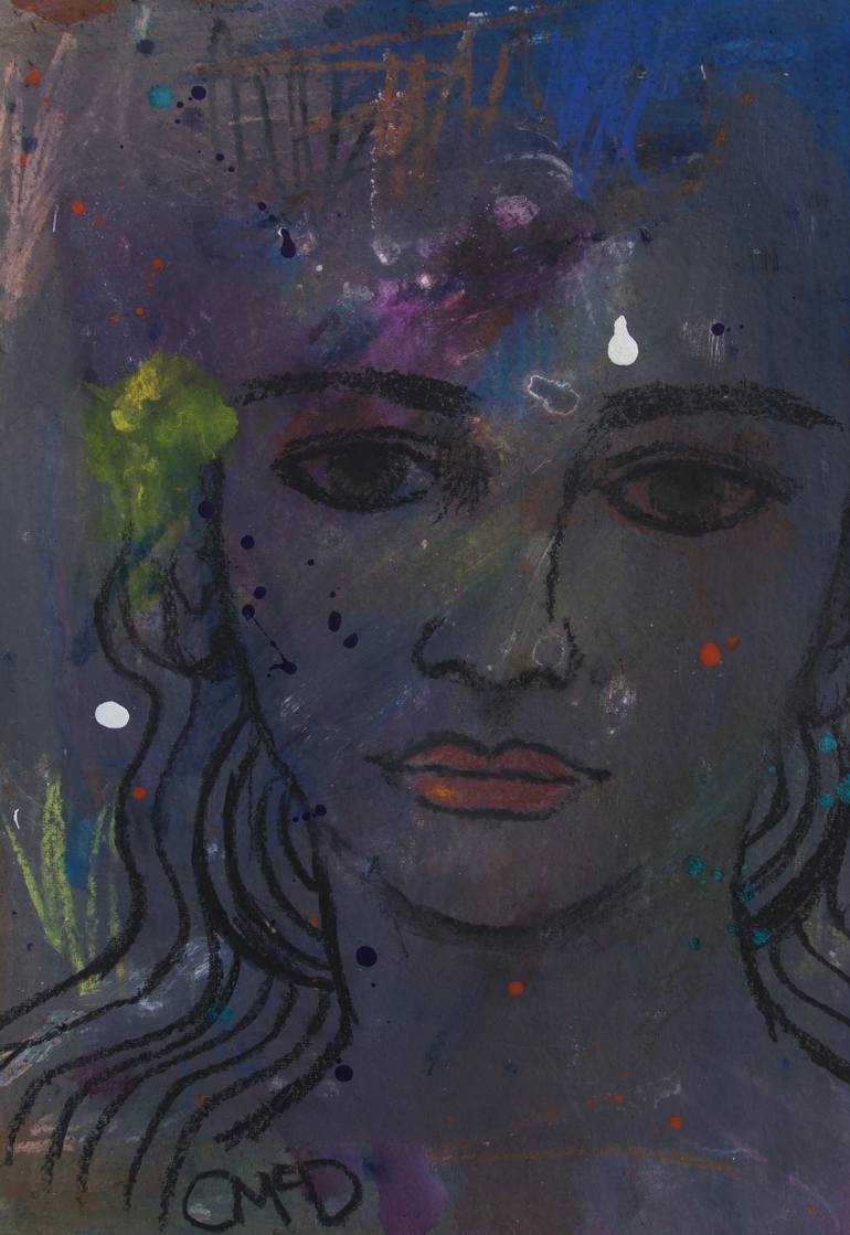 This work is dark in tone, colourful, full of mysterious energy, created using gouache, acrylic, ink and crayon on thick natural (slight wave) cotton rag paper (khadi). Its unframed but can be framed with or without a mount.