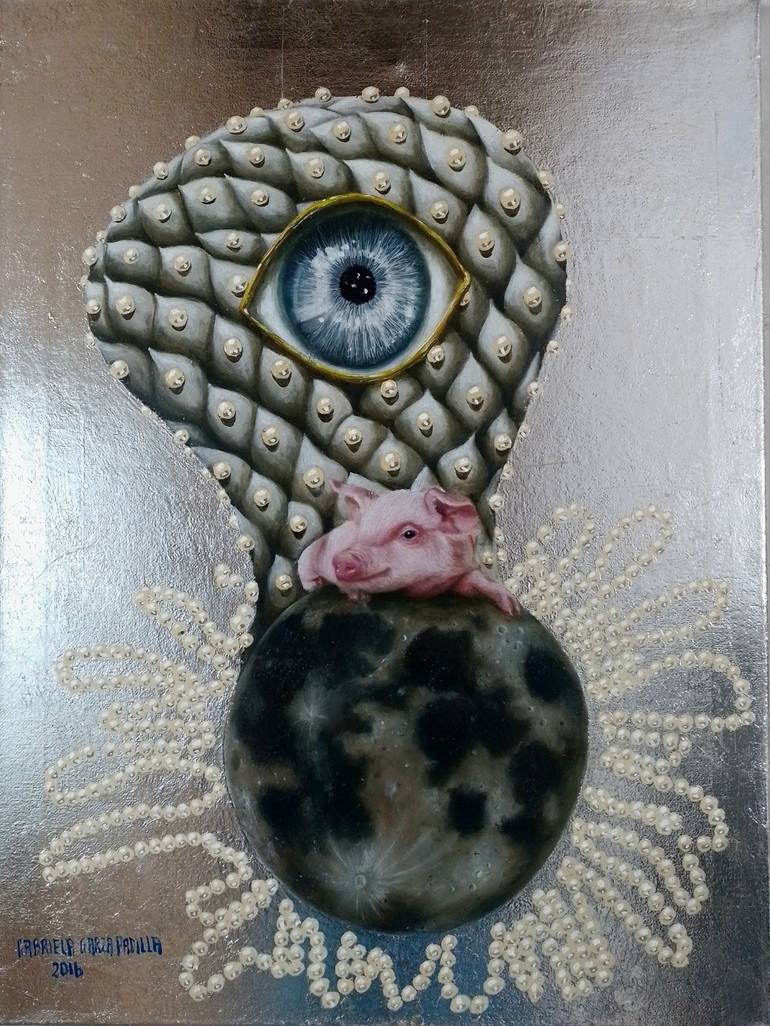 This painting is a joyous exercise uniting a cute pink piglet, the moon, an eye and pearls. Surrealist image, dreamlike, painted in oil over barnished silver aluminum foil on canvas.