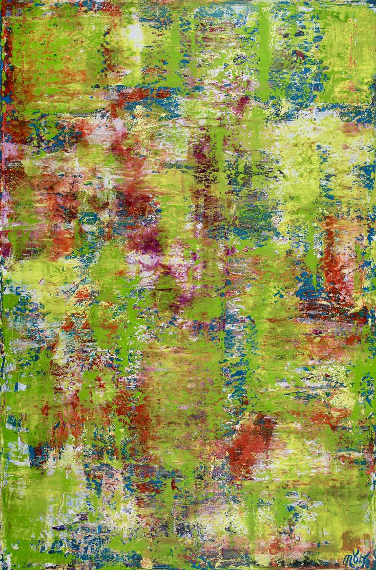 Impactful abstract inspired by the vibrant colors of the Caribbean, lush green contrasting with teal blue, orange and magenta. This artwork arrives mounted in a deep edge wooden frame, READY TO HANG, signed in front. For this work I used a large palette knife and hand mixed acrylic paint and medium...